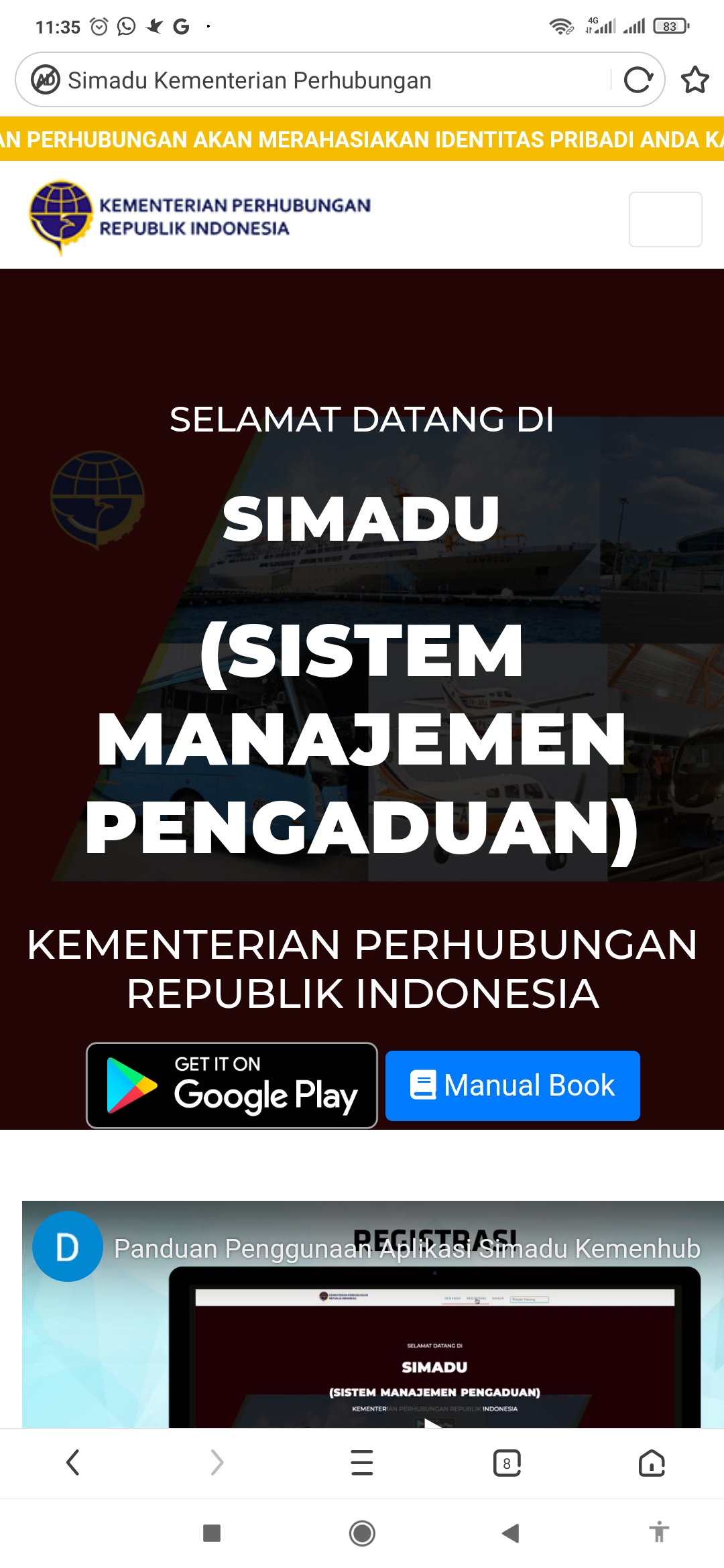 Kementerian Perhubungan (Kemhub) meluncurkan aplikasi sistem manajemen pengaduan (Simadu) pada tahun 2015 . Aplikasi itu untuk mendorong peran serta pegawai atau masyarakat dalam pencegahan pelanggaran dan penyimpangan serta pemberantasan korupsi di lingkungan Kemhub, serta sebagai upaya mengoptimalkan sistem pengaduan (whistleblowing system)