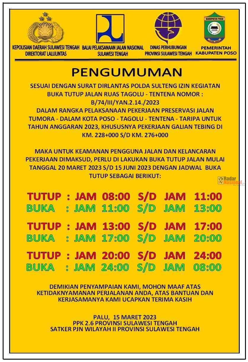 Radarnasional-Sistem buka tutup jalan akan diberlakukan di Jalan poros Tagolu-Tentena Kab.Poso dalam rangka pelaksanaan pekerjaan preservasi jalan Tumora -dalam Kota Poso-Tagolu-Tentena-Taripa Tahun anggaran 2023, khususnya pekerjaan galian tebing di km.228+000 sampai dengan km.276+000.