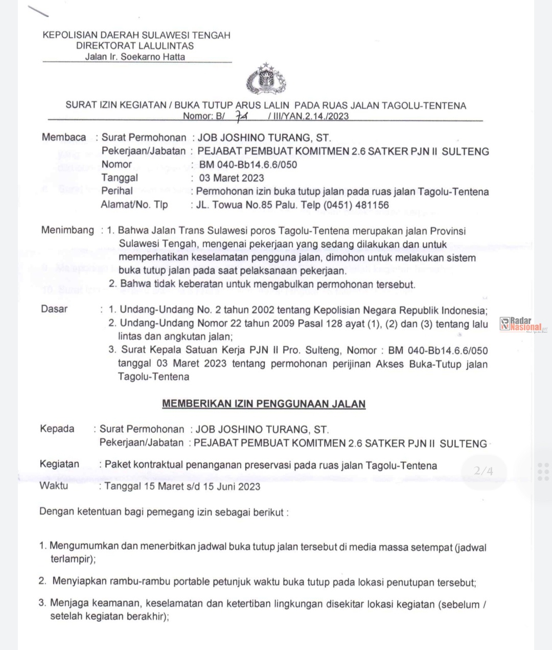 Buka tutup jalan itu diberlakukan Kepolisian Daerah Sulawesi Tengah Direktorat Lalu Lintas (Satlantas) sekaitan adanya pekerjaan yang akan dilakukan yang dilakukan Balai Pelaksanaan Jalan Nasional Sulawesi Tengah kepada PPK 2.6 Job Turang dengan No Surat :B/74/III /YAN.2.14./2023.