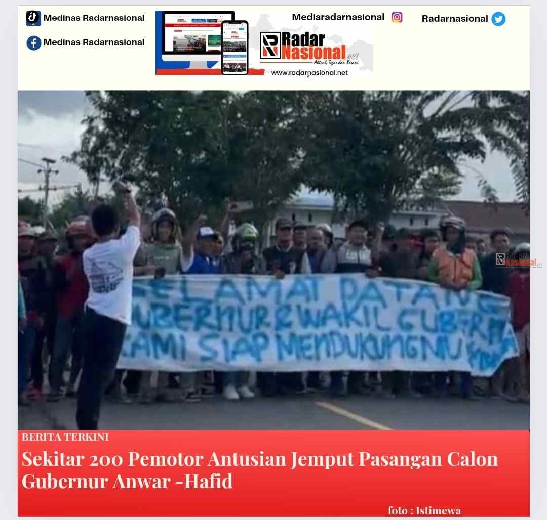 Radarnasional,Banggai-Sekitar 200 pemotor jemput dan kawal pasangan bakal calon (balon) Gubernur dan Wakil Gibernur Sulawesi Tengah 2024, Dr.Anwar Hafid, M.Si – dr.Reny A Lamadjido, M.Kes Selasa (30/7-2024) di pintu masuk wilayah desa Tirtasari kecamatan Toili Kabupaten Banggai.