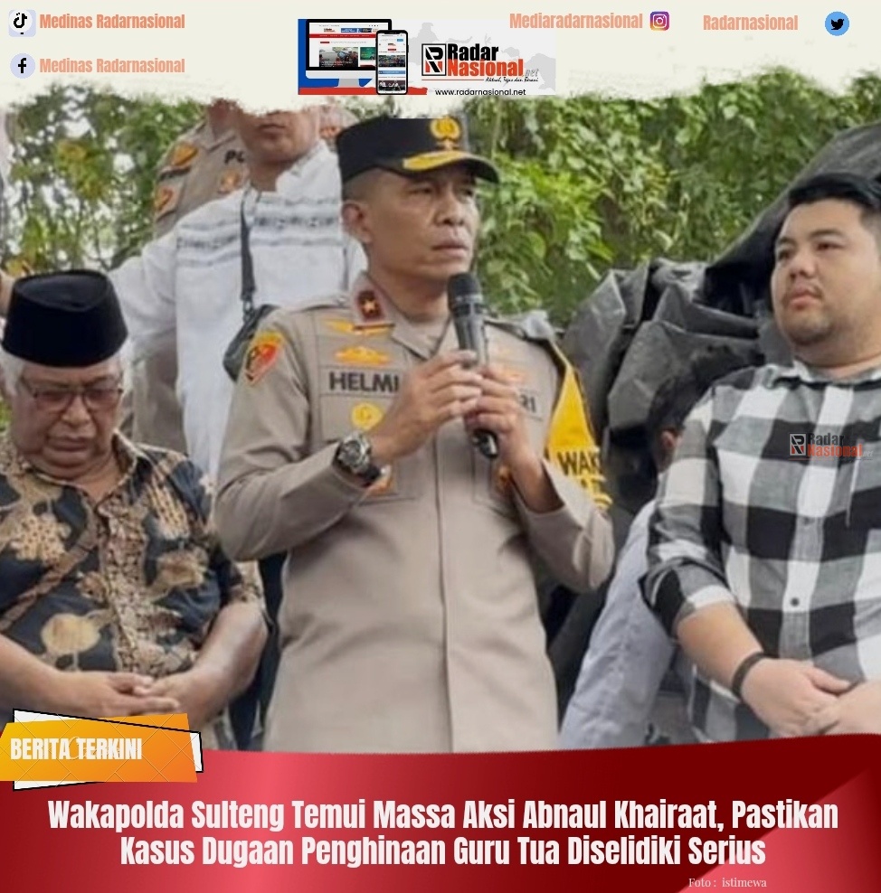 Radarnasional,Palu – Wakapolda Sulawesi Tengah, Brigjen Pol. Helmi Kwarta Kusuma Putra Rauf, turun langsung menemui massa aksi dari Abnaul Khairaat di depan Gedung DPRD Sulawesi Tengah pada Jumat (11/4/2025). Aksi tersebut digelar sebagai bentuk protes terhadap dugaan penghinaan yang dilakukan oleh Fuad Plered terhadap ulama karismatik, Guru Tua Habib Idrus bin Salim Aljufri.