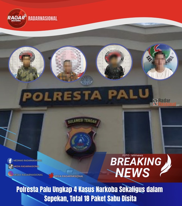 RadarNasional,PALU — Kepolisian Resor Kota (Polresta) Palu menunjukkan keseriusannya dalam memerangi peredaran narkotika dengan mengungkap empat kasus penyalahgunaan sabu hanya dalam waktu kurang dari sepekan. Dalam operasi yang dilakukan tim Opsnal Satuan Reserse Narkoba, empat pelaku berhasil diamankan di wilayah Tavanjuka, Palu Barat, dan Anoa, dengan barang bukti total 18 paket sabu.