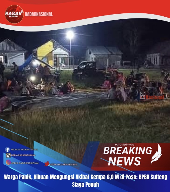 RadarNasional,Poso – Gempabumi dengan Magnitudo 60 mengguncang wilayah Pamona Tenggara dan Pamona Selatan, Kabupaten Poso, Sulawesi Tengah, pada Kamis (24/7-2025) pukul 21.06 WITA menyebabkan ratusan rumah rusak dan ribuan warga terpaksa mengungsi.