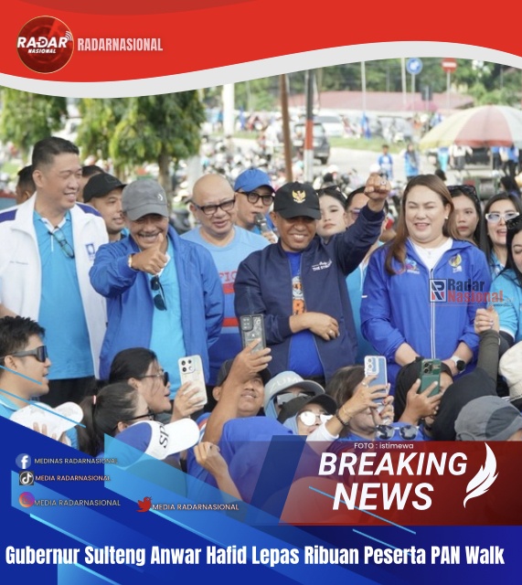 RadarNasional,PALU – Gubernur Sulawesi Tengah, Dr. H. Anwar Hafid, M.Si., melepas ribuan peserta jalan sehat PAN Walk dalam rangka HUT ke-27 Partai Amanat Nasional (PAN), Minggu (30/8/2025) di Lapangan Imanuel Palu. Kegiatan yang berlangsung semarak ini turut dihadiri Ketua DPW PAN Sulawesi Tengah yang juga anggota DPR RI, Syarifuddin Sudding.