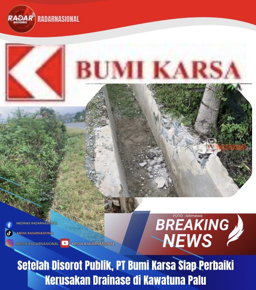 Palu — Setelah ramai diberitakan mengenai kondisi drainase Jalan Kebun Sari, Kawatuna, Kota Palu, yang tampak retak, rusak, dan ditumbuhi semak belukar, pihak PT Bumi Karsa akhirnya angkat bicara.