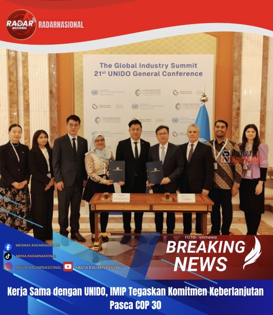 Radarnasional,MOROWALI, 29 November 2025 — PT Indonesia Morowali Industrial Park (IMIP) kembali menegaskan komitmennya terhadap pengembangan kawasan industri berkelanjutan di tengah momentum global menuju ekonomi hijau pasca COP 30. Salah satu langkah strategis ditempuh melalui penandatanganan Joint Declaration dengan United Nations Industrial Development Organization (UNIDO) dalam rangkaian Sidang Umum ke-22 UNIDO dan Global Industrial Summit di Riyadh, Arab Saudi, pada 24 November 2025.