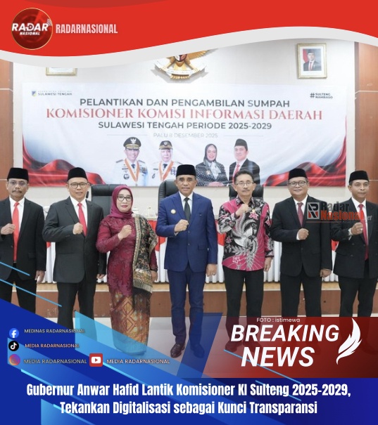 Radarnasional,Palu – Gubernur Sulawesi Tengah, Dr. H. Anwar Hafid, M.Si., resmi melantik lima Komisioner Komisi Informasi (KI) Sulteng periode 2025–2029 di Gedung Pogombo, Senin (8/12/2025). Mereka adalah H. Moh. Rizky Lembah, Hary Azis, Indra A. Yosvidar, Santi Rahmawaty, dan Irfan Deny Pontoh.