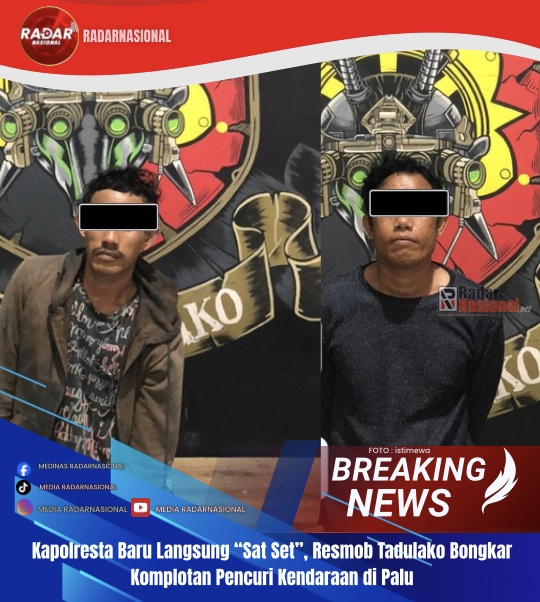 Radarnasional,Palu — Tim Resmob Tadulako Polresta Palu membekuk komplotan pencurian yang beraksi di sejumlah lokasi di Kota Palu, termasuk di lokasi rental mobil di Jalan Datu Pamusu, Kelurahan Kamonji, Kecamatan Palu Barat. Pengungkapan ini menjadi salah satu langkah cepat penegakan hukum sejak Kombes Pol. Hari Rosena resmi menjabat sebagai Kapolresta Palu.8/01/2026